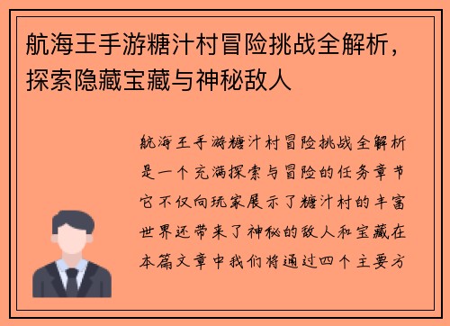 2025-07-22 13:28:25《橙色匕首任务揭秘:背后隐藏的真相与挑战分析》这篇文章将从多个角度深入探讨橙色匕首任务的背景、任务内容、挑战与游戏设计的深层含义。首先,本文将简要回顾橙色匕首任务的基本情况,解析其游戏内的重要性和玩家参与的独特之处。接着,文章将从任务的历史背景、设计难度、玩家参与的挑战以及任务背后隐藏的社会文化等方...